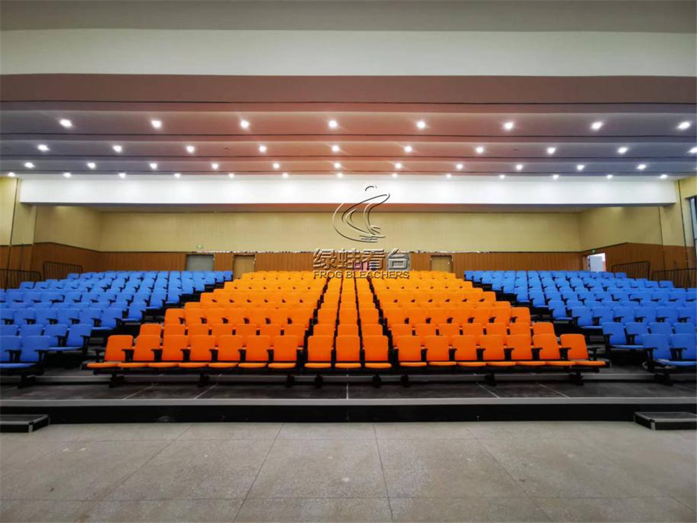 活動看臺采用鋼焊接組裝連接,所有安裝用鋼件均采用靜電噴涂處理,層寬1800mm。首層高330mm,錯層高400mm, 活動看臺踏板材料選用17mm防火防滑舞臺板,活動看臺為電動控制,保證左右行走距離一致,在伸展與回縮中無定向跑偏、卡死、打滑、跳齒現(xiàn)象?;顒涌磁_觀眾席采用高靠背吹塑翻板座椅,后置式安裝方式,座距490mm,后邊和側(cè)邊(第一層除外)加安全防護(hù)欄桿,欄桿高度為1100mm;并且看臺展開時,即處于使用狀態(tài)下,觀眾可通過伸縮看臺的走道直通二樓區(qū)域。