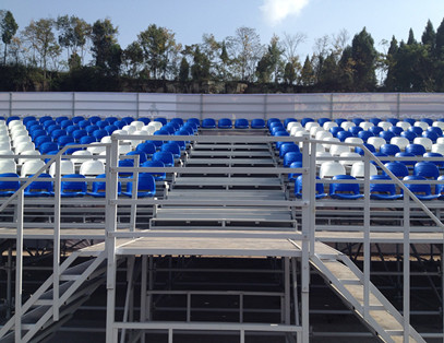 該看臺屬斜梁式拼裝看臺,整體結構采用標準件、模塊化設計,看臺的各種部件,如支架,踏板,側板,護欄,座椅等,皆可隨意 搭配組裝,可根據場地及觀眾席位需要進行各種層高、位數的拼裝組合。具有結構簡單,搭建及拆卸方便,便于運輸及儲存等特點。
