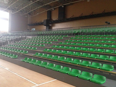 活動看臺座椅采用高密度中空吹塑低靠背座椅,座椅規格為:座高200mm,座寬420mm,座深450mm,背高160mm,中心距480mm。前置式安裝,共計8層。