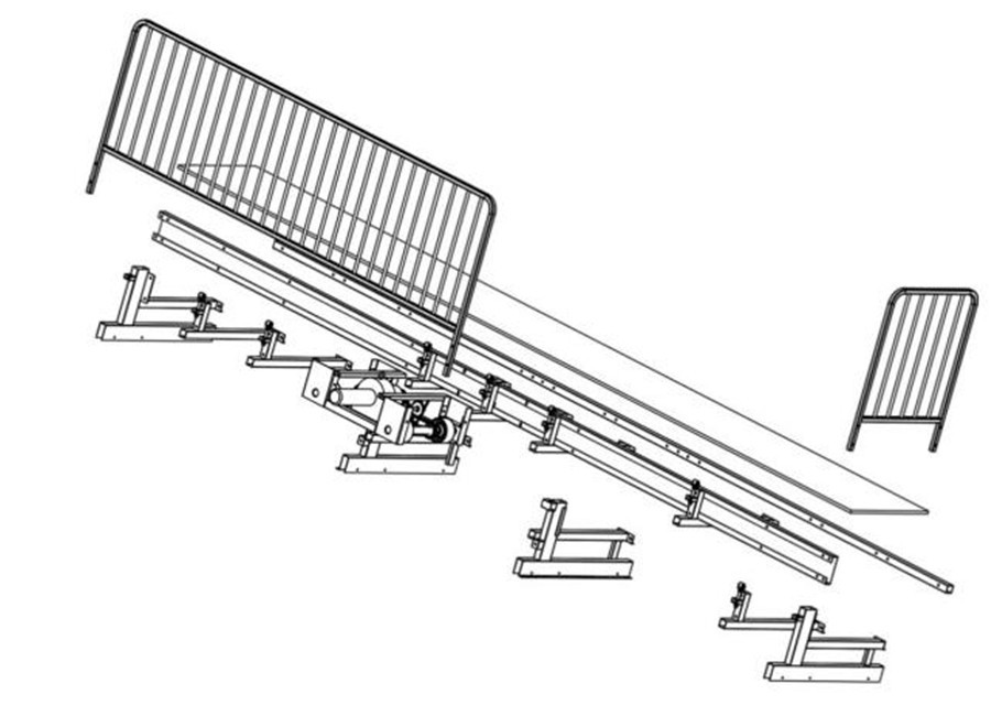 伸縮看臺床架側邊無切角部分安裝伸縮型安全應護欄在伸縮的過程中護欄無需插拔,護欄的表面采用噴塑處理。看臺的兩側每層床架側邊安裝有斜護欄,護欄的高度為1100MM,看臺的后側裝有垂直護欄,護欄的高度為1100MM,兩側的護欄和后側的護欄包圍起來兩者之間的空隙不超100MM,護欄采用鋼結構,表面外框采用30mm×30mm家具管彎曲成矩形框,護欄直角部分做圓弧處理。護欄框內嵌垂直部位采用焊接連接,內嵌垂直桿件采用直徑19mm家具管,桿件凈距也不應大于100mm。側護欄帶有斜角使得每一層的護欄處于不同立面上,在看臺伸展收縮時,不同層護欄不會互相碰撞,護欄無需插拔。側護欄與床架連接是由三個螺栓連接,保證護欄能夠實現橫向沖擊不出現斷裂,不出現變形。各護欄的水平靜載荷應能達到:加載60Kg/㎡30秒,卸載后無明顯永久變形。護欄的垂直靜載荷應能達到:加載100Kg/㎡1分鐘,卸載后無明顯永久變形。