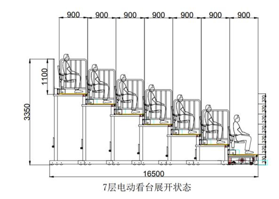 (2)看臺整體為垂直支撐結構。看臺層寬900mm,尾層寬900mm;首層高330mm,其他層高300mm。(伸縮看臺為定制產品,可根據實際場地和客戶需求,略微調整尺寸。)