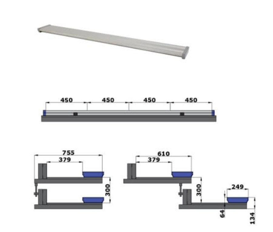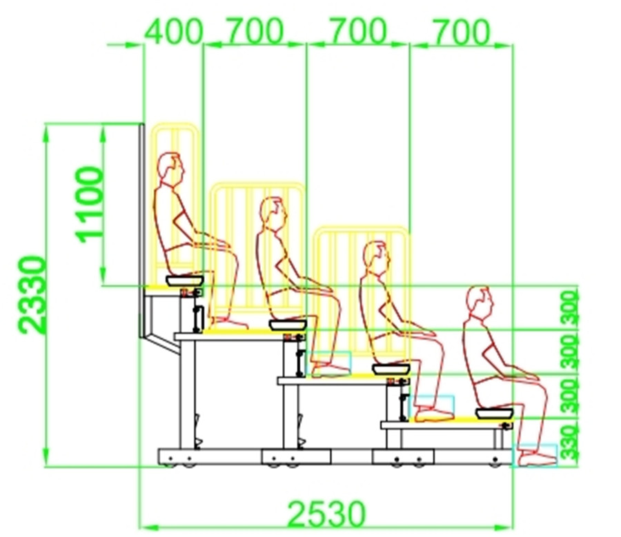 (2)看臺整體為垂直支撐結(jié)構(gòu)。看臺層寬700mm,尾層寬400mm;首層高330mm,其他層高300mm。(伸縮看臺為定制產(chǎn)品,可根據(jù)實際場地和客戶需求,略微調(diào)整尺寸。)