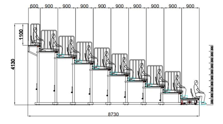 (2)看臺整體為垂直支撐結構。看臺層寬900mm,尾層寬600mm;首層高330mm,其他層高300mm。(伸縮看臺為定制產品,可根據(jù)實際場地和客戶需求,略微調整尺寸。)