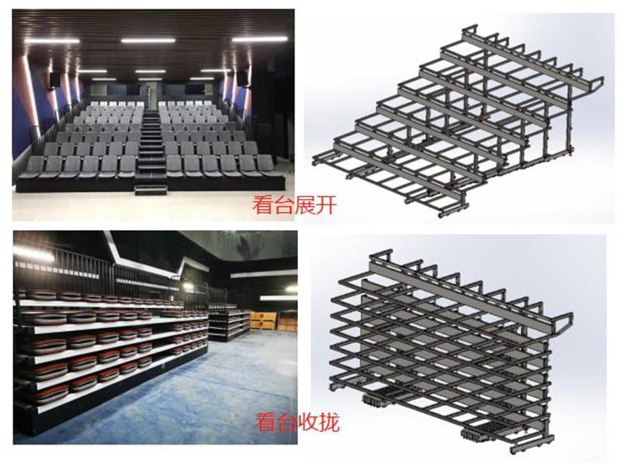 伸縮看臺也稱為活動看臺,活動看臺的稱呼是相對于固定看臺而來,伸縮看臺拉伸成臺階形時,看臺上的座椅供觀眾舒適地欣賞節(jié)目,收縮成匣子狀(似抽屜)時則占用很少的空間,讓出場地以安排他用。伸縮看臺可充分利用室內的有限面積,滿足不同功能情況下的多座位要求。伸縮看臺廣泛應用于體育館、會議室、示教室、演播廳、多功能廳等。